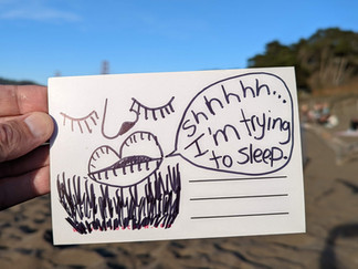 These are a series of drawings done during the pandemic while sitting at Baker Beach in San Francisco / Yelamu. We (John, Ash, and me) went there to be outside and together, for a bit of respite. I brought some old postcards I had laying around and my favorite drawing utensil: a black sharpie. A few joints in, I let loose. This is what I drew.